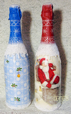 Статус: Offline | шесть из ларца - одинаковых с лица.. собственно названием все сказано))) декупаж 6 бутылок шампусика.. совершенно одинаковые, на сколько это возможно))) открыла конвейер))) декупаж салфеткой.. в этом году пользовалась некоторыми хитростями.. может кому то пригодится.. мне лично очень помогло, по сравнению с прошлым годом.. переводить салфетку с файла (изнанкой к себе, лицевой к файлу и расправить все.. воды много, что б салфетка плавала, потом слить просто излишки воды.. если салфетка не скользит, значит мало воды..) и при этом покрыть белую-основу краску лаком перед салфеткой, это решение многих проблем и просто супер! салфетка лучше скользит и легко можно смыть, если не нравится.. и начать заново.. я не нарадуюсь.. как я в прошлом году мучилась.. и как в этом все просто получается.. горлышки покрасила акриловой краской.. и контуром нанесла рисунок.. сосульки это клей-пистолет.. снег, это манка + пва + белая акриловая краска.. сверху краской прошлась, губкой.. т.к. манка вообще много краски забирает и проще потом покрасить.. для украшения блестки..