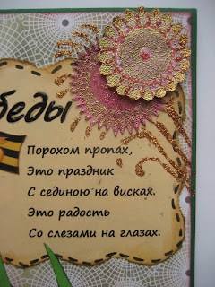 Статус: Offline | Давно давно ничего не делала  Вот начинаю проявлять творческую активность. В школе Лизы в классе всем ребятам раздавали адреса для поздравлений ветеранам. Вот и сделала открыточку для поздравления незнакомой нам женщине. Гвоздики сделаны из крафт-бумаги. В правом верхнем углу пыталась изобразить салют в честь победы. Использовала эмбосинг и глитеры. И фоновую бумагу подбирала с кружочками- похоже чтобы было на салют. Не знаю насколько это получилось. Внутри в рамочку, найденную в инете впечатала текст. Элементы- звездочки, буквы, бантик из георгиевской ленточки- всё покрыто Глосси акцентом для объёма.