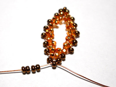 Набираем на проволоку одну темную и три светлых бисерины и проходим вторым концом проволоки в последнюю светлую бисерину навстречу первому