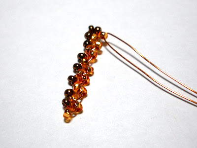 Отрезаем бокорезами проволоку , набираем три бисерины и в две предпоследние одним концом проволоки проходим навстречу другому концу.